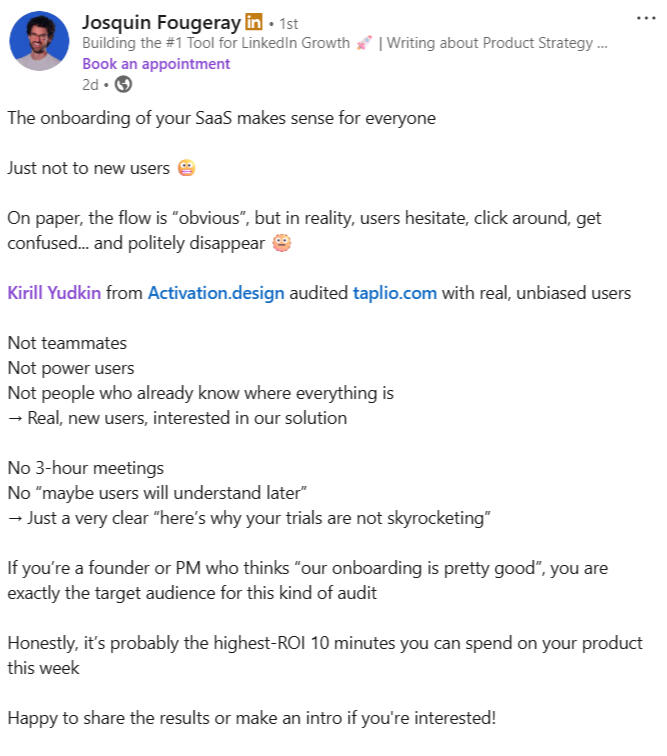 I also found that the product teams in Sales SaaS tools are too close to the product to see friction in their onboarding. They know what to click, when and why.
